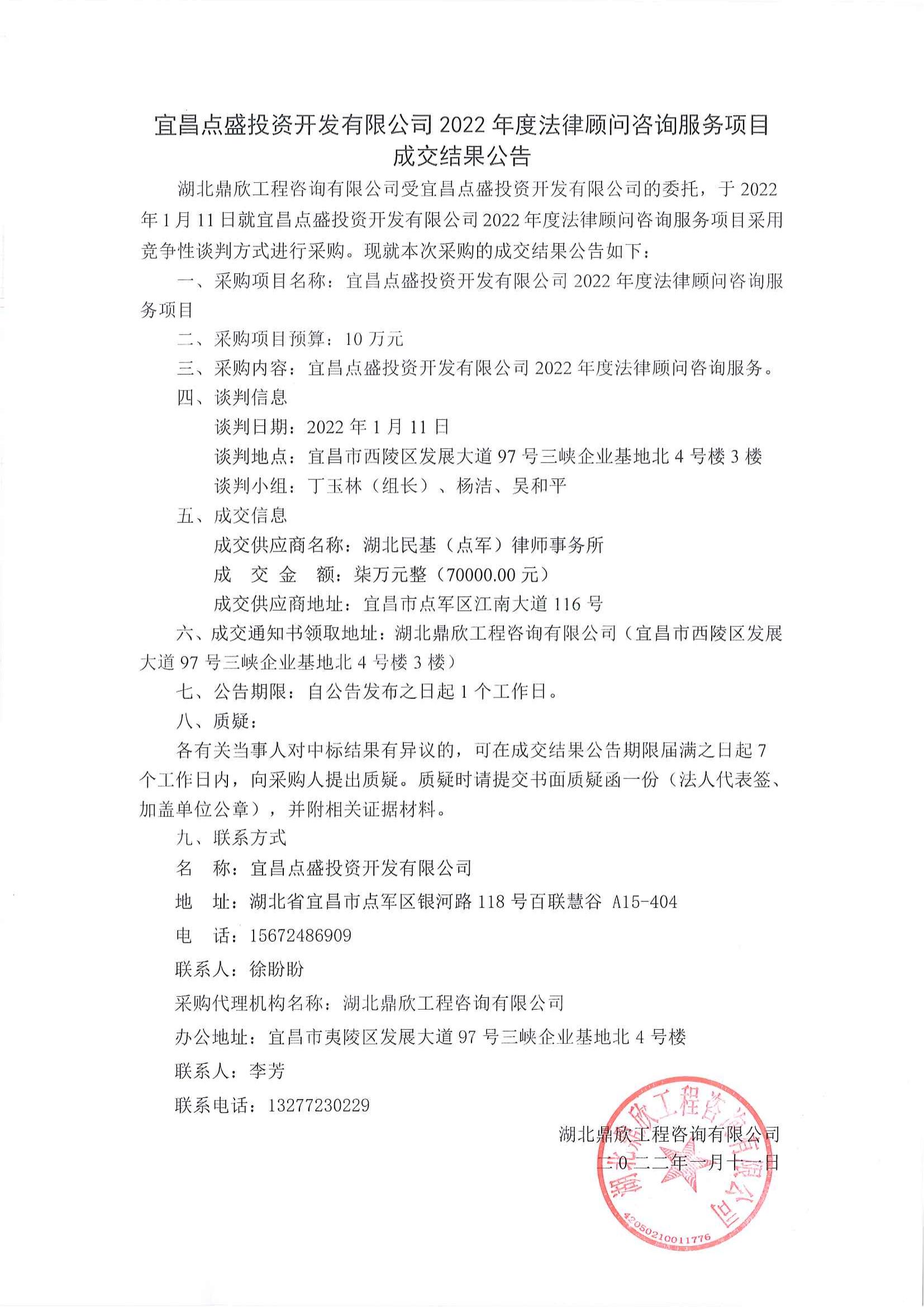 宜昌點(diǎn)盛投資開(kāi)發(fā)有限公司2022年度法律顧問(wèn)咨詢(xún)服務(wù)項(xiàng)目成交公告