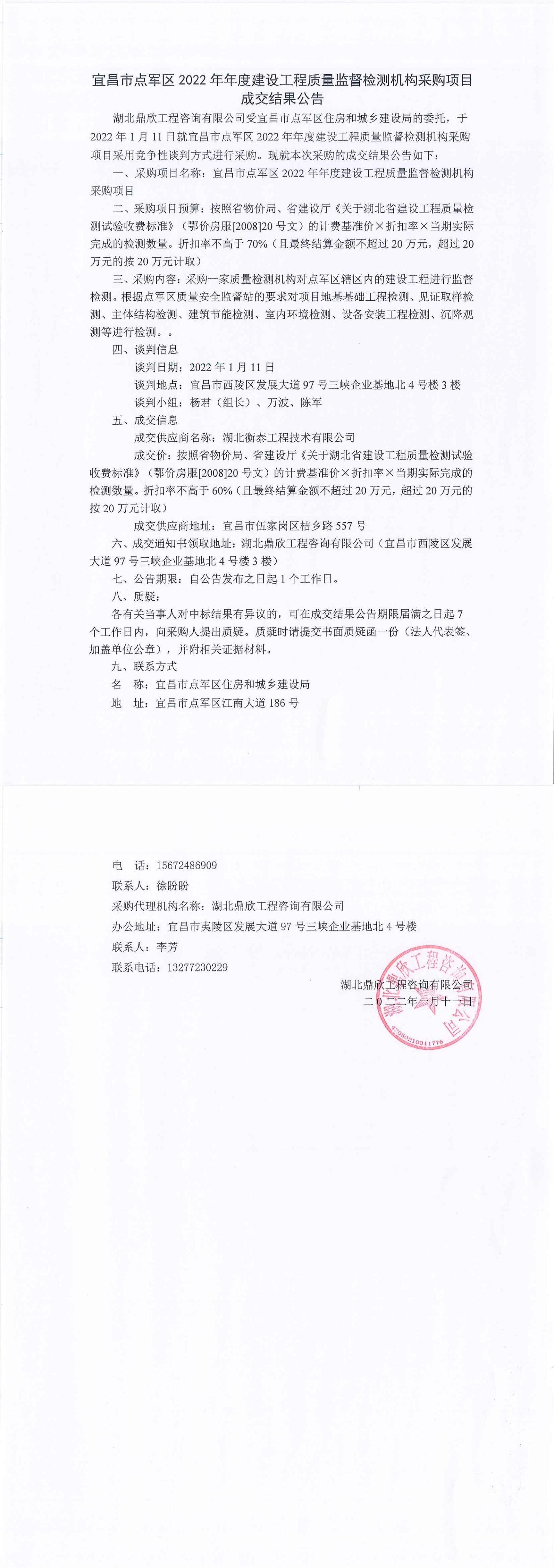 宜昌市點軍區(qū)2022年年度建設(shè)工程質(zhì)量監(jiān)督檢測機構(gòu)采購項目成交公告