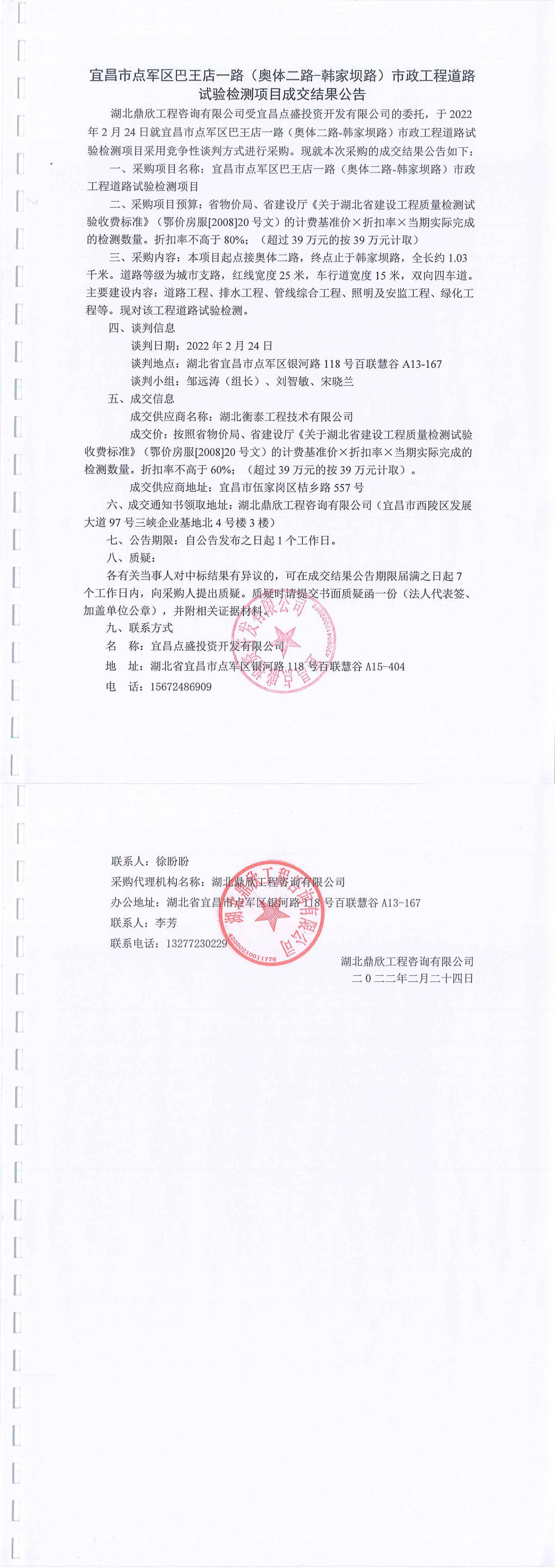 宜昌市點(diǎn)軍區(qū)巴王店一路(奧體二路-韓家壩路)市政工程道路試驗(yàn)檢測項目成交公告
