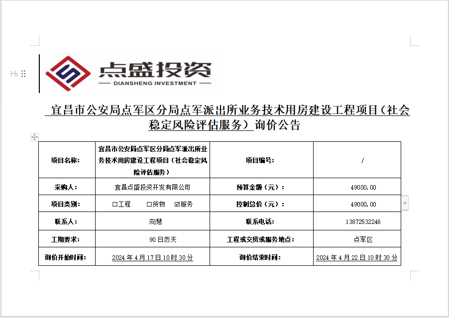 宜昌市公安局點(diǎn)軍區(qū)分局點(diǎn)軍派出所業(yè)務(wù)技術(shù)用房建設(shè)工程項(xiàng)目(社會(huì)穩(wěn)定風(fēng)險(xiǎn)評(píng)估服務(wù))詢(xún)價(jià)公告