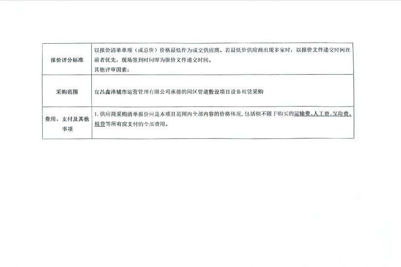 宜昌鑫澤城市運營管理有限公司管道敷設設備租賃采購項目詢價公告