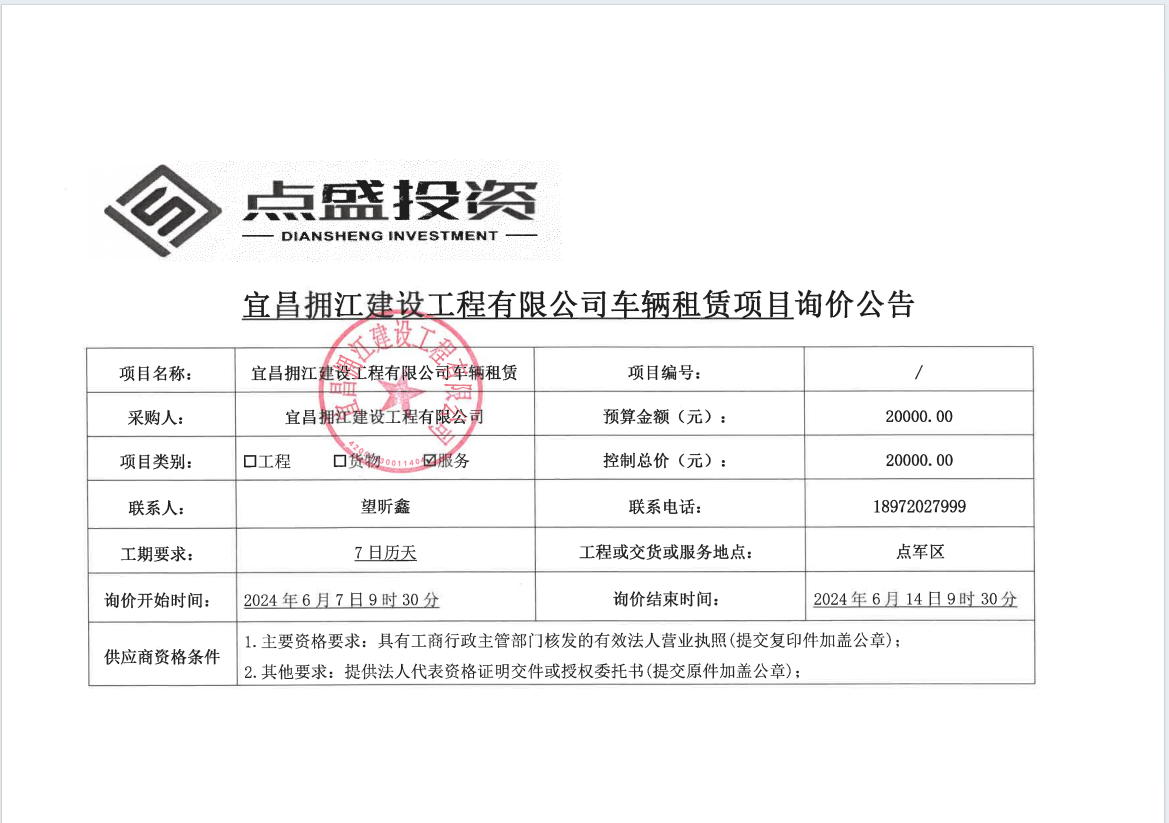宜昌擁江建設(shè)工程有限公司車輛租賃項(xiàng)目詢價(jià)公告