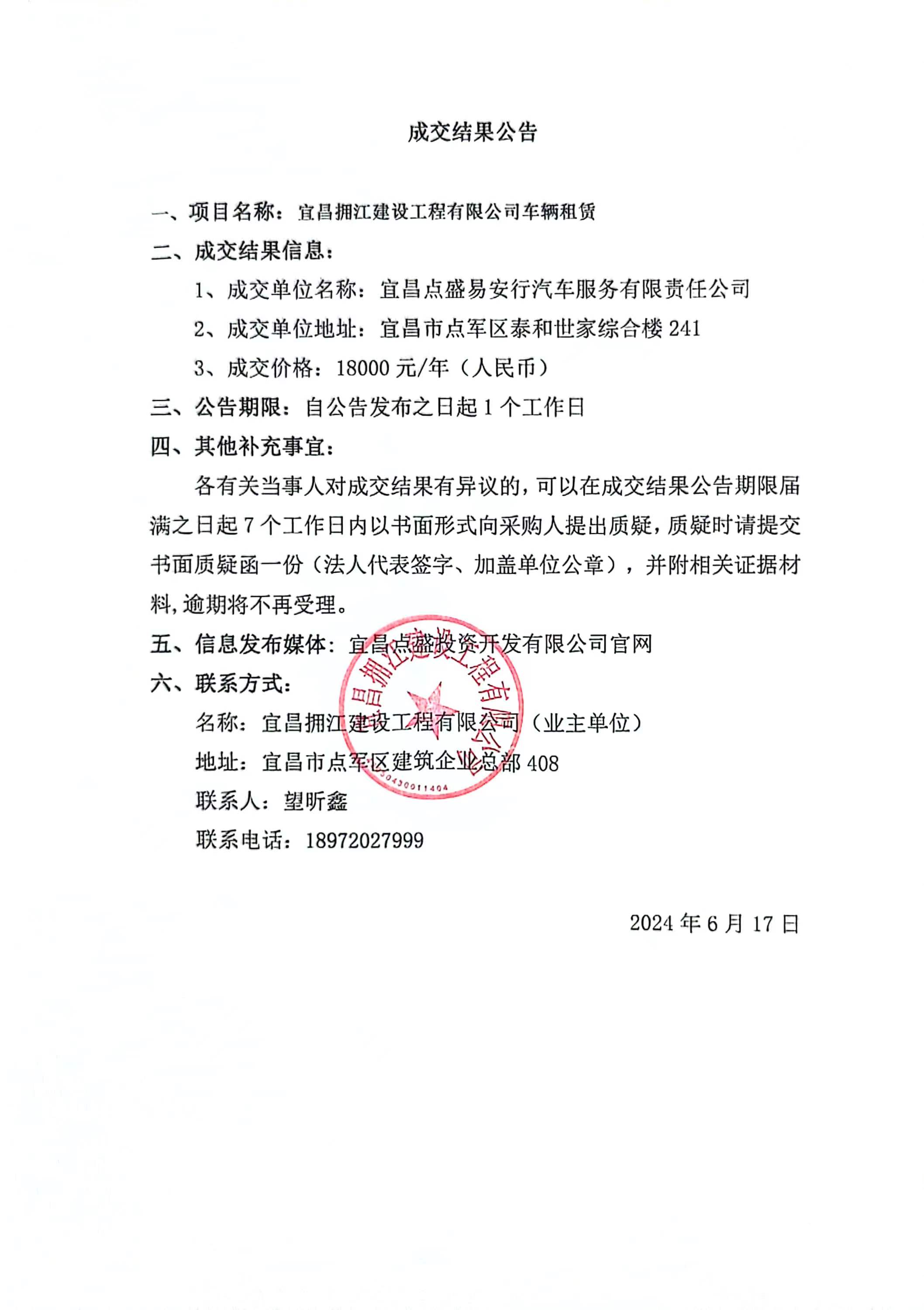 宜昌擁江建設(shè)工程有限公司車輛租賃項(xiàng)目成交公告