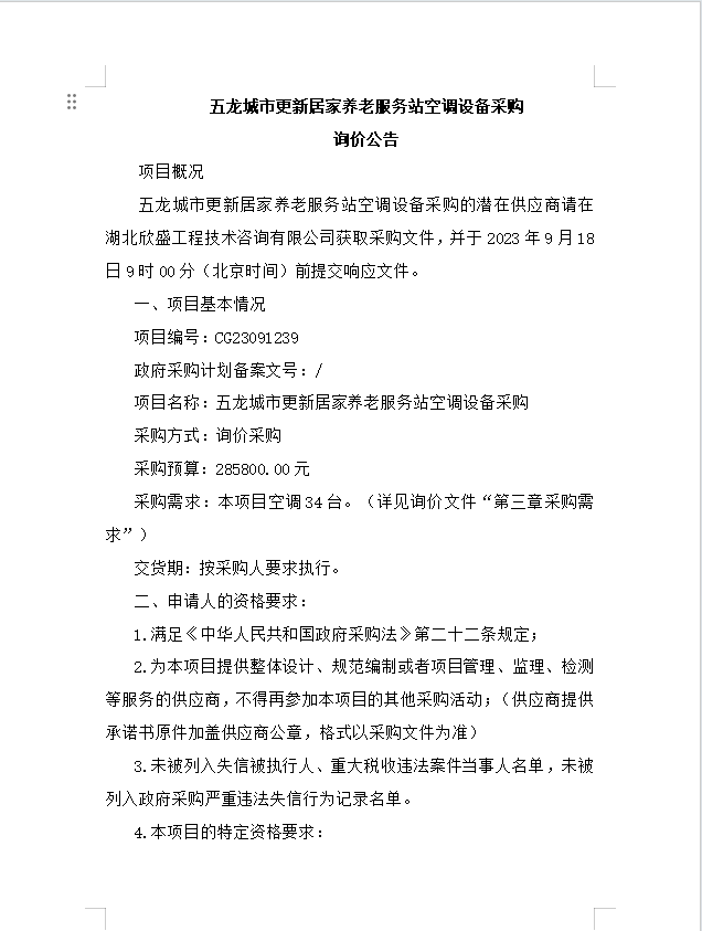 五龍城市更新居家養(yǎng)老服務(wù)站空調(diào)設(shè)備采購(gòu)詢(xún)價(jià)公告