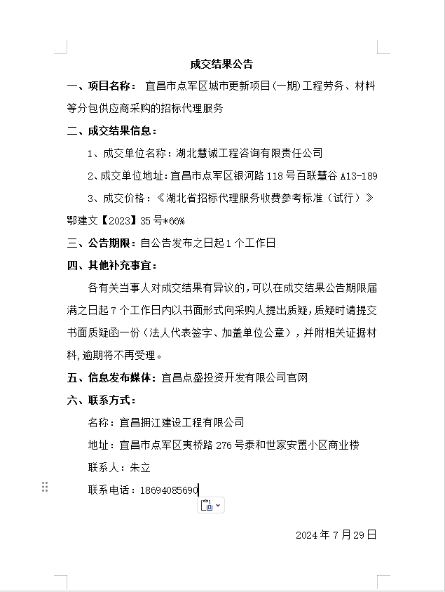 宜昌市點(diǎn)軍區(qū)城市更新項(xiàng)目(一期)工程勞務(wù)、材料等分包供應(yīng)商采購的招標(biāo)代理服務(wù)成交結(jié)果公告