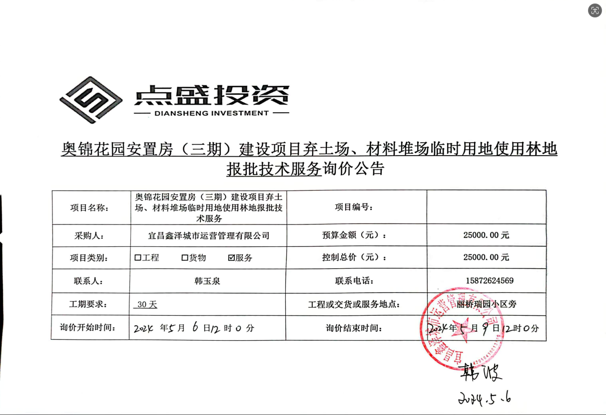 奧錦花園安置房(三期)建設(shè)項(xiàng)目棄土場(chǎng)、材料堆場(chǎng)臨時(shí)用地使用林地報(bào)批技術(shù)服務(wù)詢價(jià)公告