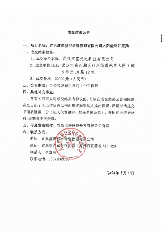 宜昌鑫澤城市運營管理有限公司太陽能路燈采購項目成交公告