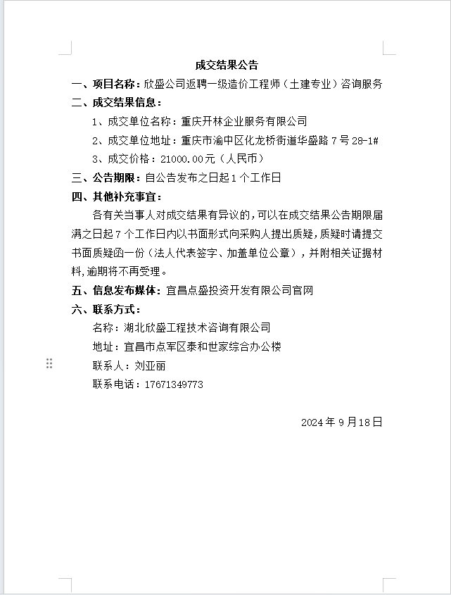 欣盛公司返聘一級(jí)造價(jià)工程師(土建專(zhuān)業(yè))咨詢服務(wù) 成交公告