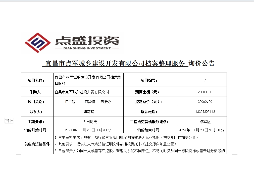 宜昌市點(diǎn)軍城鄉(xiāng)建設(shè)開發(fā)有限公司檔案整理服務(wù)詢價公告