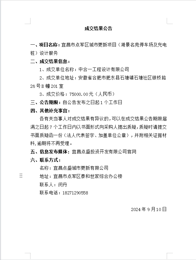 宜昌市點(diǎn)軍區(qū)城市更新項(xiàng)目(湖景名苑停車場及充電樁)設(shè)計(jì)服務(wù)成交公告