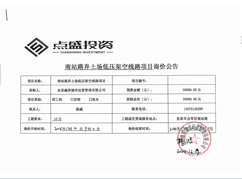 南站路棄土場低壓架空線路項(xiàng)目詢價(jià)公告
