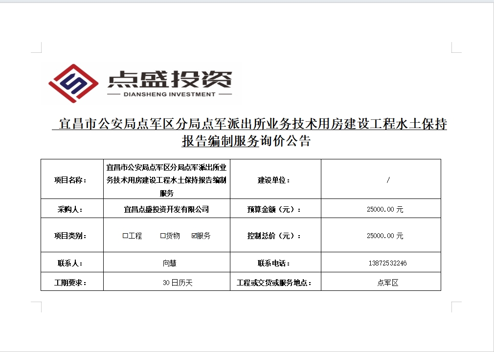 宜昌市公安局點軍區(qū)分局點軍派出所業(yè)務(wù)技術(shù)用房建設(shè)工程水土保持報告編制服務(wù)詢價公告